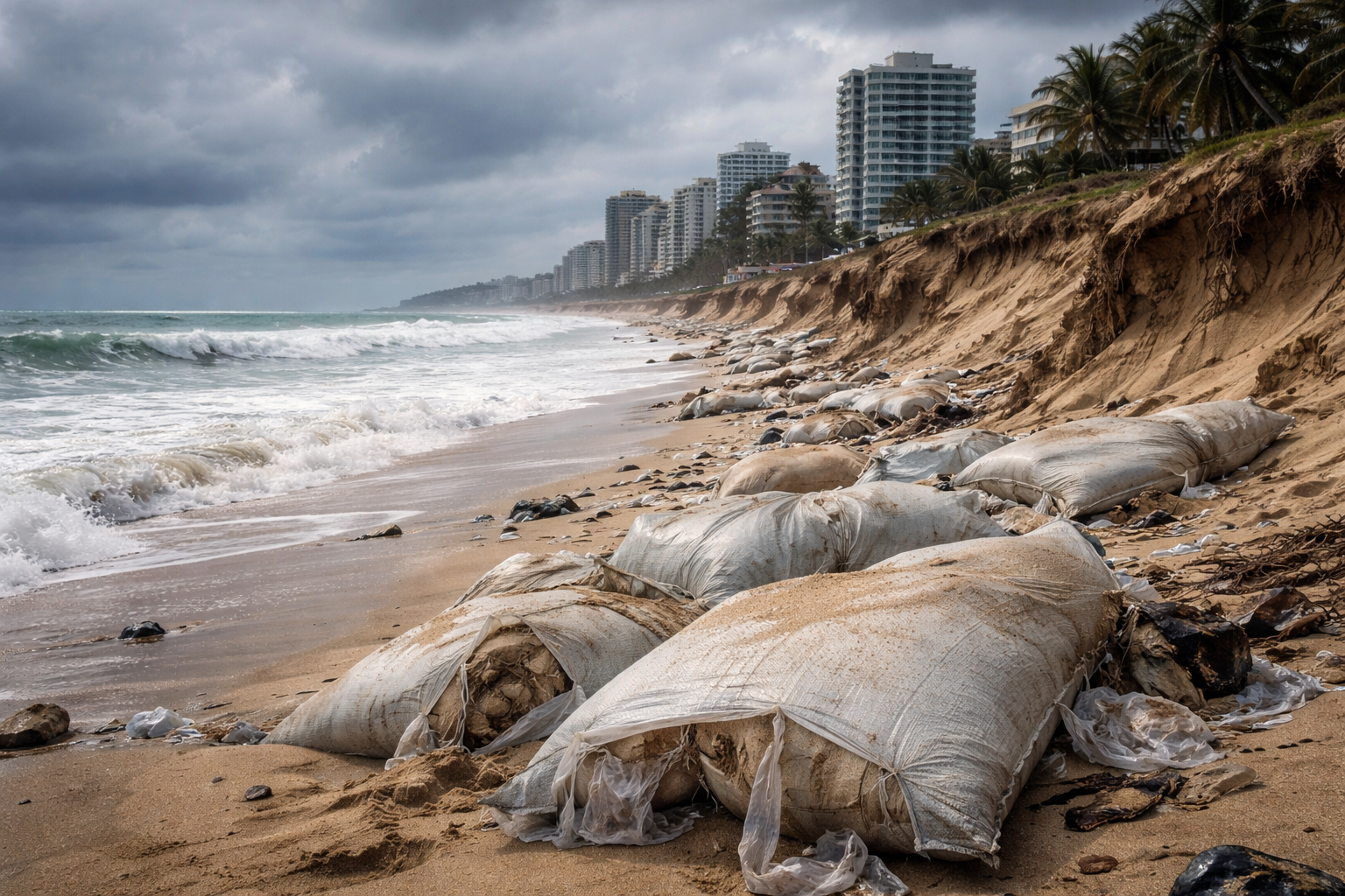 O governo do Paraná recebeu em março deste ano uma multa de dois milhões e quinhentos mil reais do Ibama. A infração era grave e simbólica ao mesmo tempo. Fiscais encontraram o litoral de Matinhos coberto por sacos plásticos de ráfia cheios de areia espalhados pela água e pela areia. A prefeitura havia tentado conter o avanço do mar com essa solução caseira e emergencial. O resultado foi uma praia poluída por material sintético e um servidor público multado por crime ambiental. A ironia completa reside no fato de que aquela mesma areia agora retida em sacos deveria estar livre, formando dunas naturais. Aquelas dunas foram destruídas décadas atrás para dar lugar a quiosques e hotéis que agora ameaçam cair no mar.